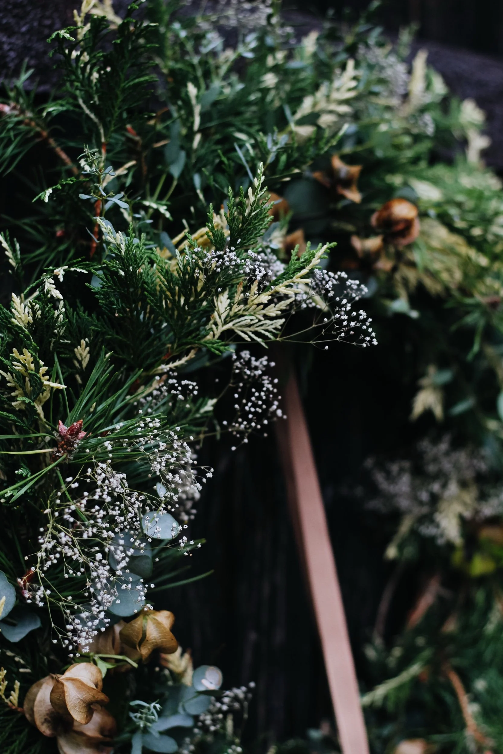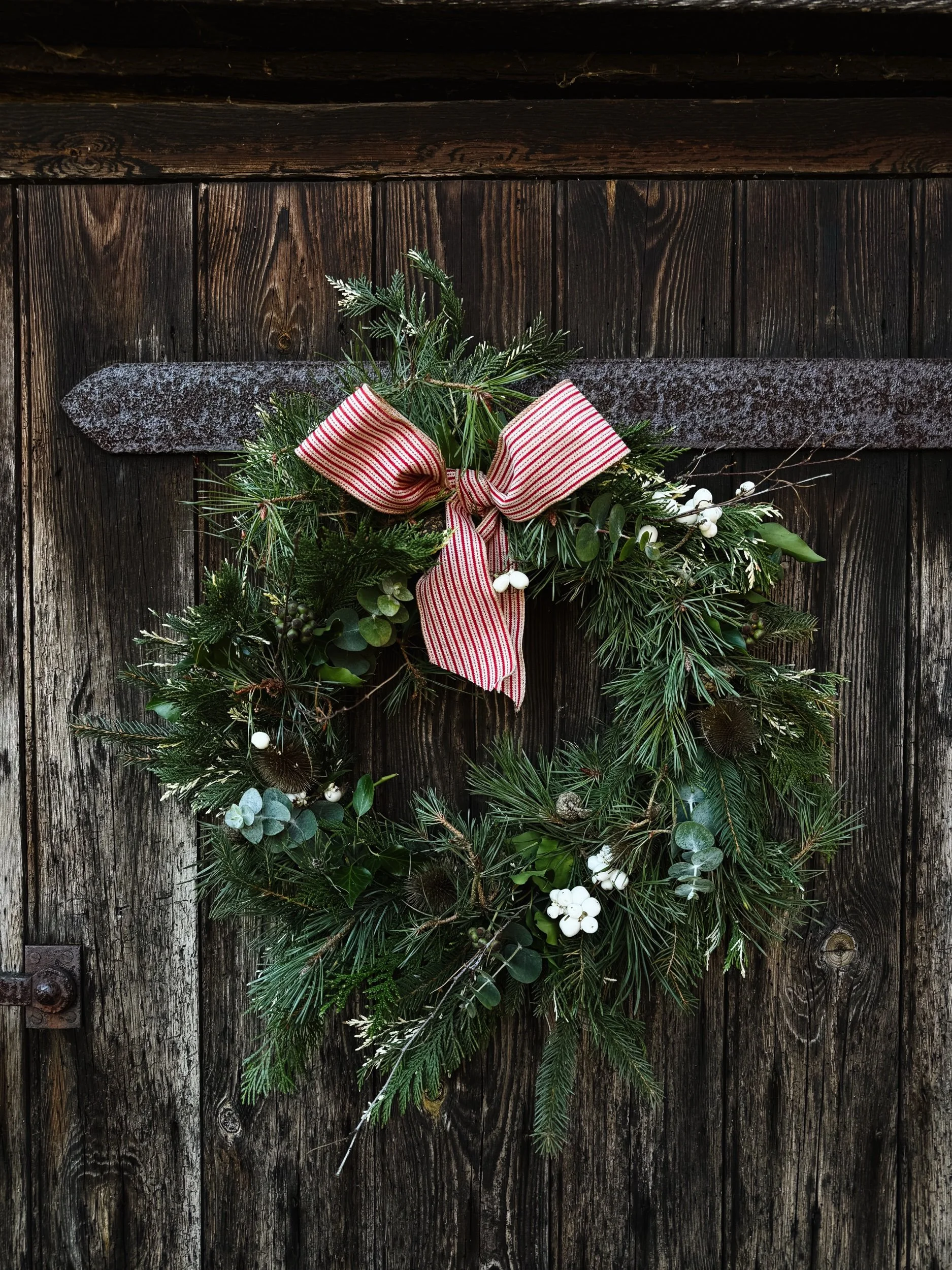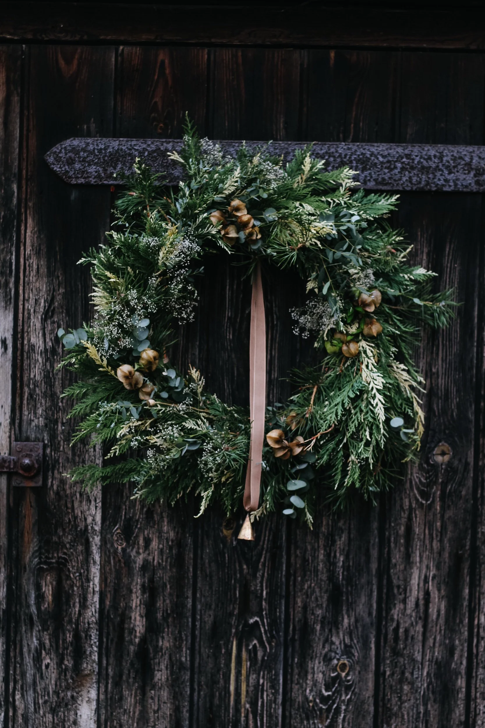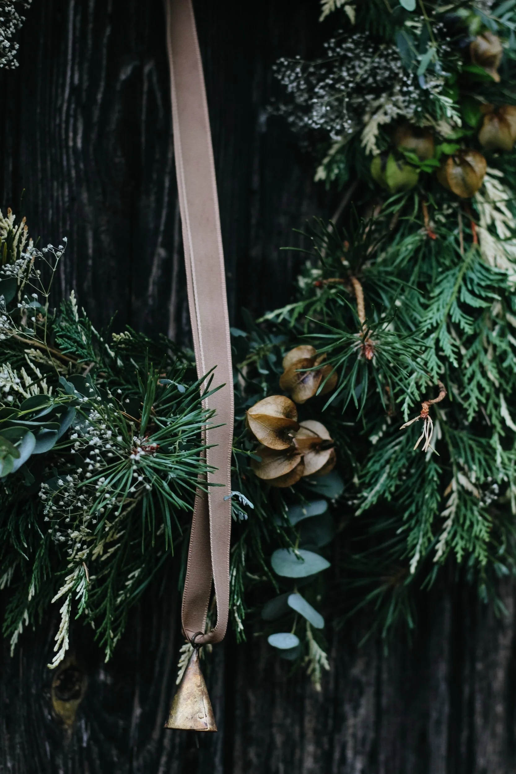 The Walled Garden Christmas Wreath made for you on a handmade English willow wreath base, filled with winter foliage and materials gathered & foraged from the Walled Garden, finished with a vintage haberdashery ribbon & little bell.